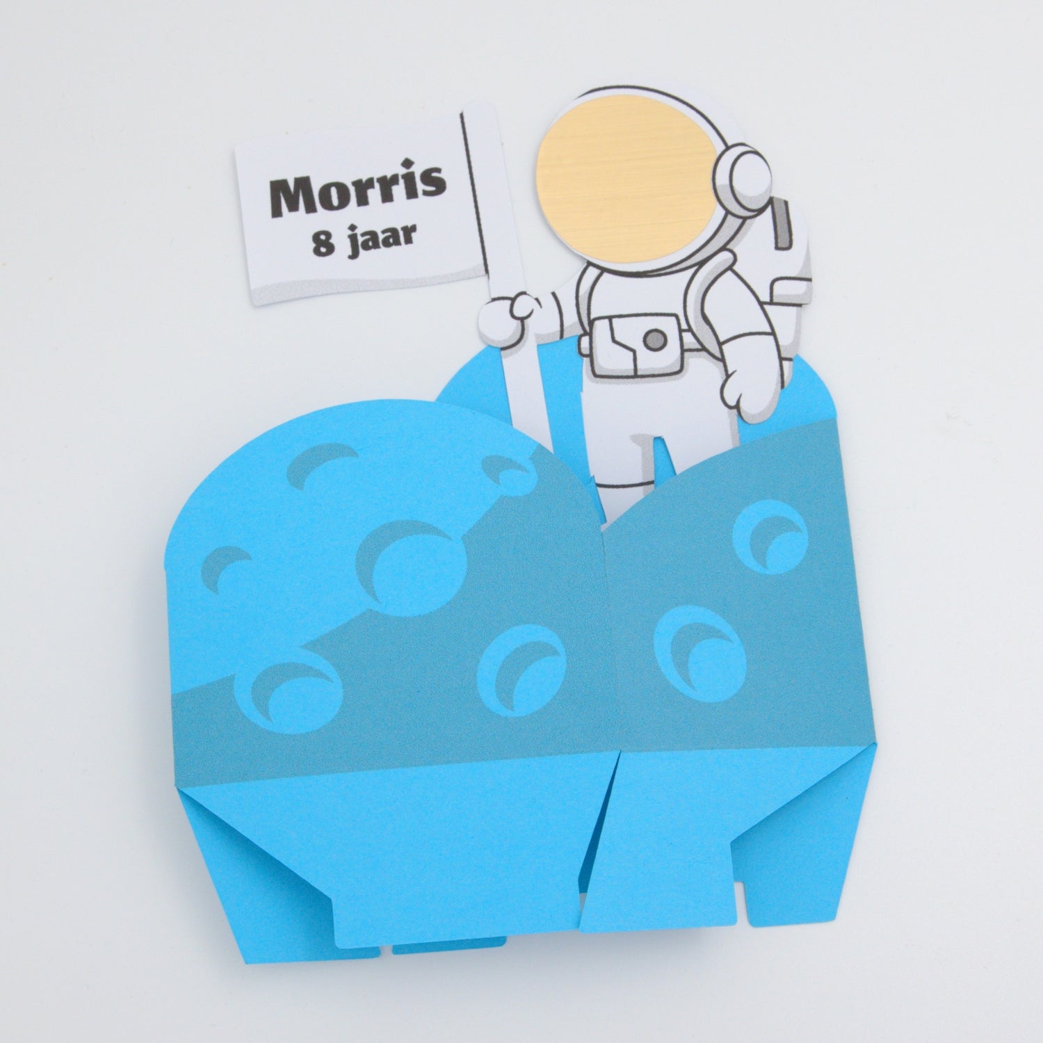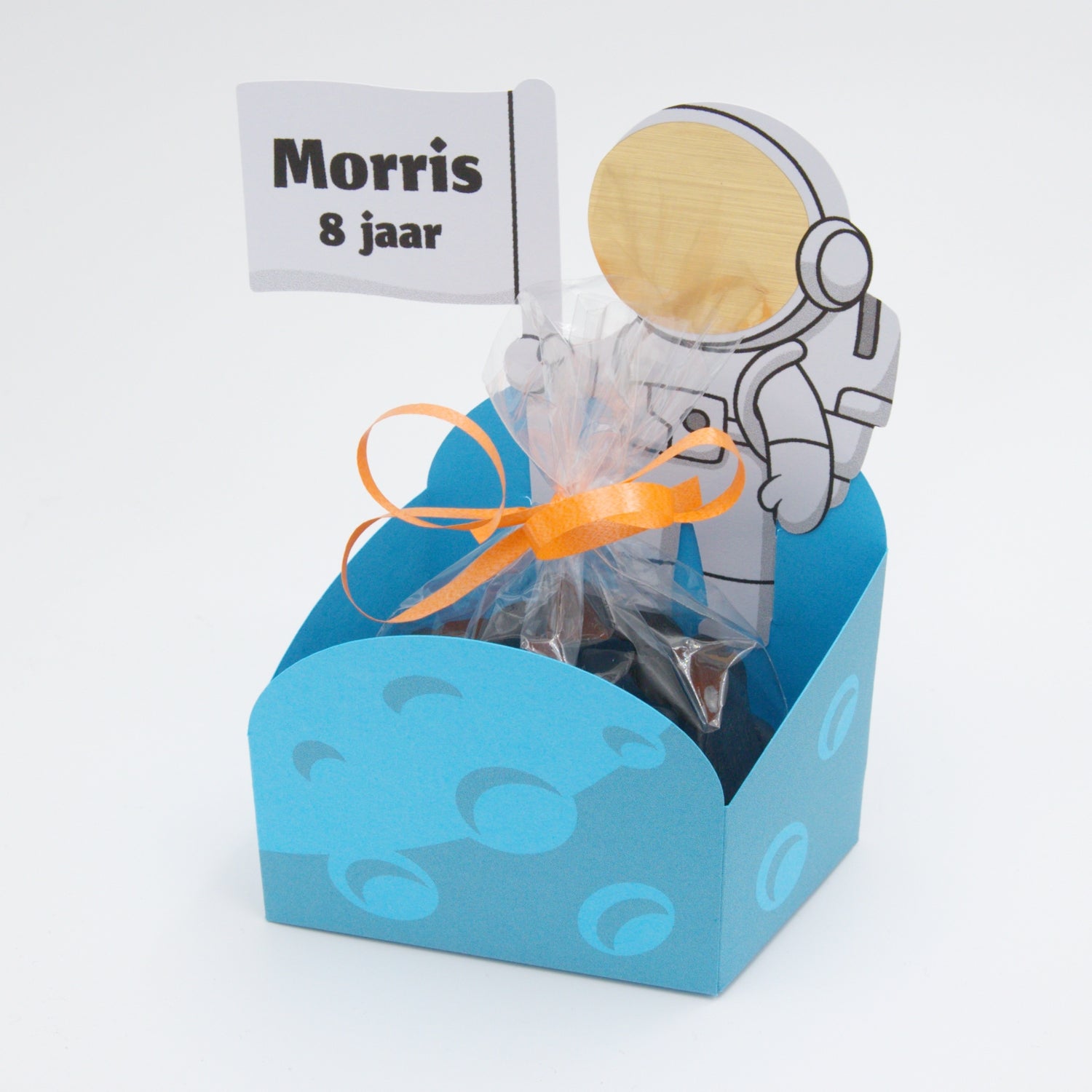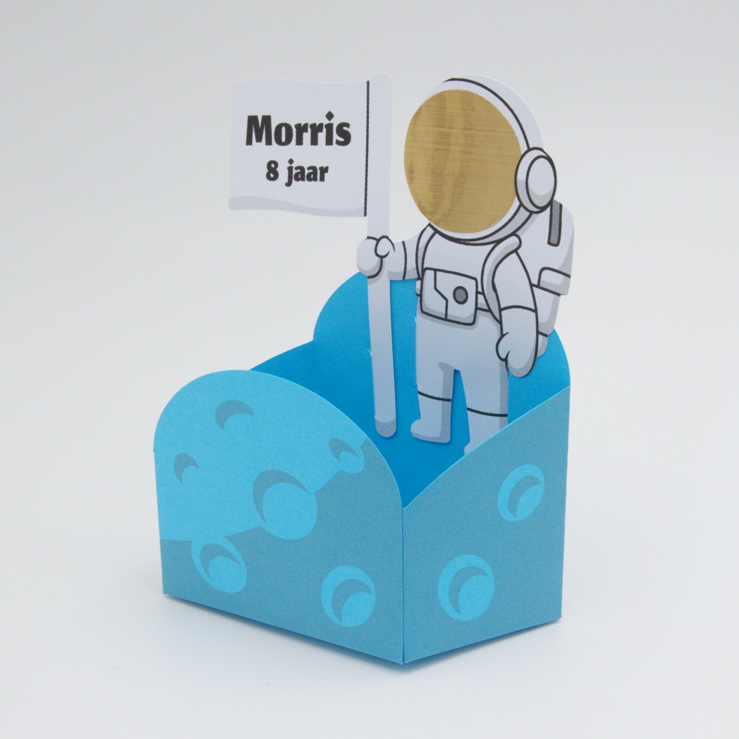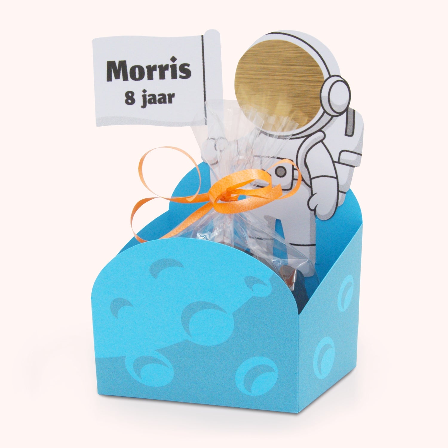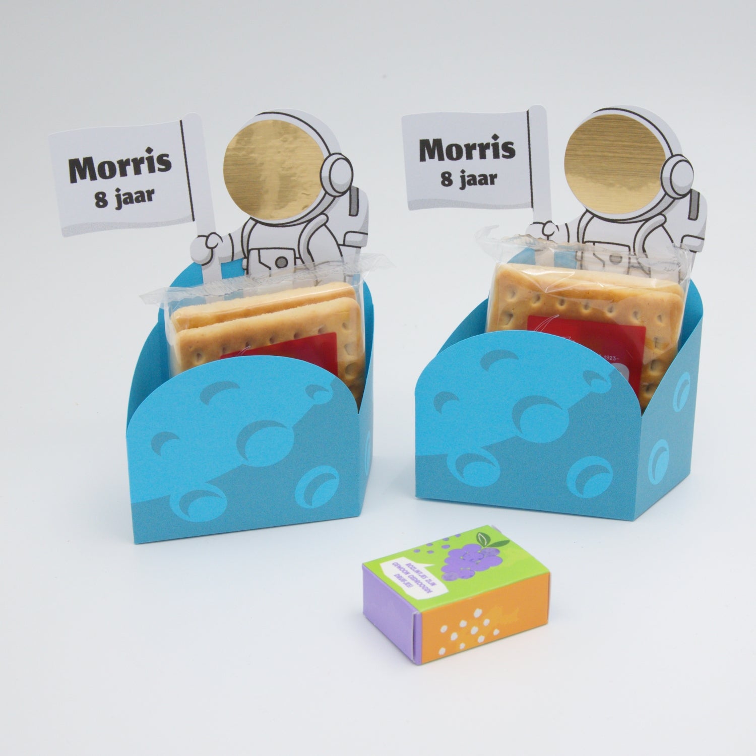 Op de vlag van de astronaut wordt de naam en de leeftijd van de jarige geprint. Deze doosjes zijn ongeveer 7,5 x 4,5 x 13 cm. De planeten zijn blauw en de astronauten hebben goudkleurige vizieren.
