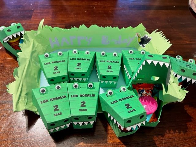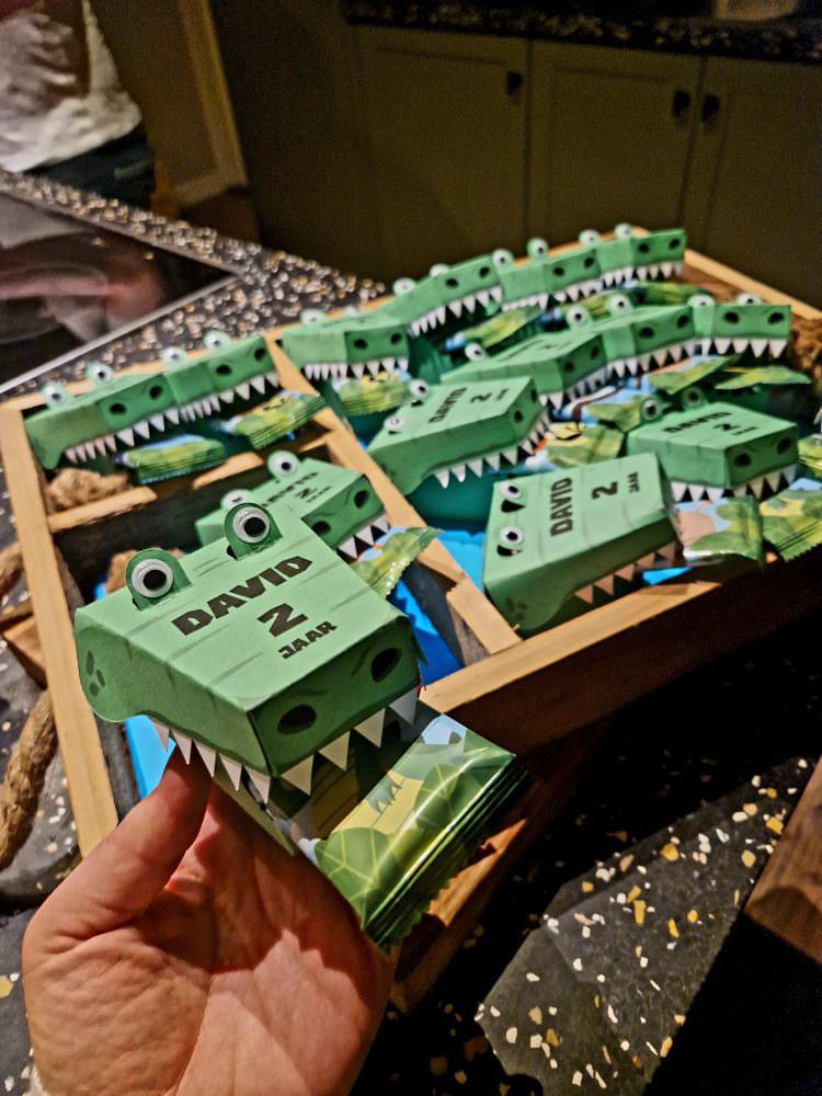 Om het helemaal af te maken kun je ze uitdelen op een dienblad met een groen of blauw servet op de bodem alsof het lijkt of de krokodillen in het gras of water liggen.