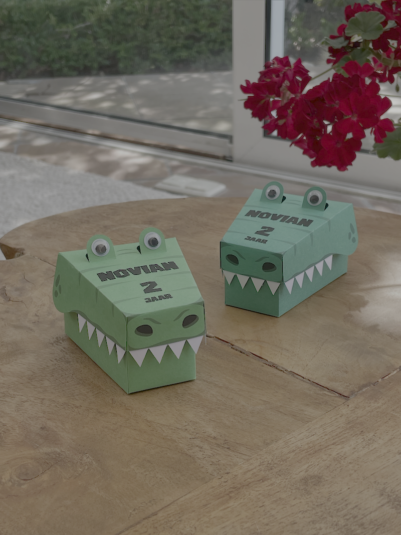 De krokodillen worden plat geleverd in een envelop of brievenbusdoos en kunnen in elkaar worden gevouwen. De plakranden zijn al voorzien van dubbelzijdig plakband.