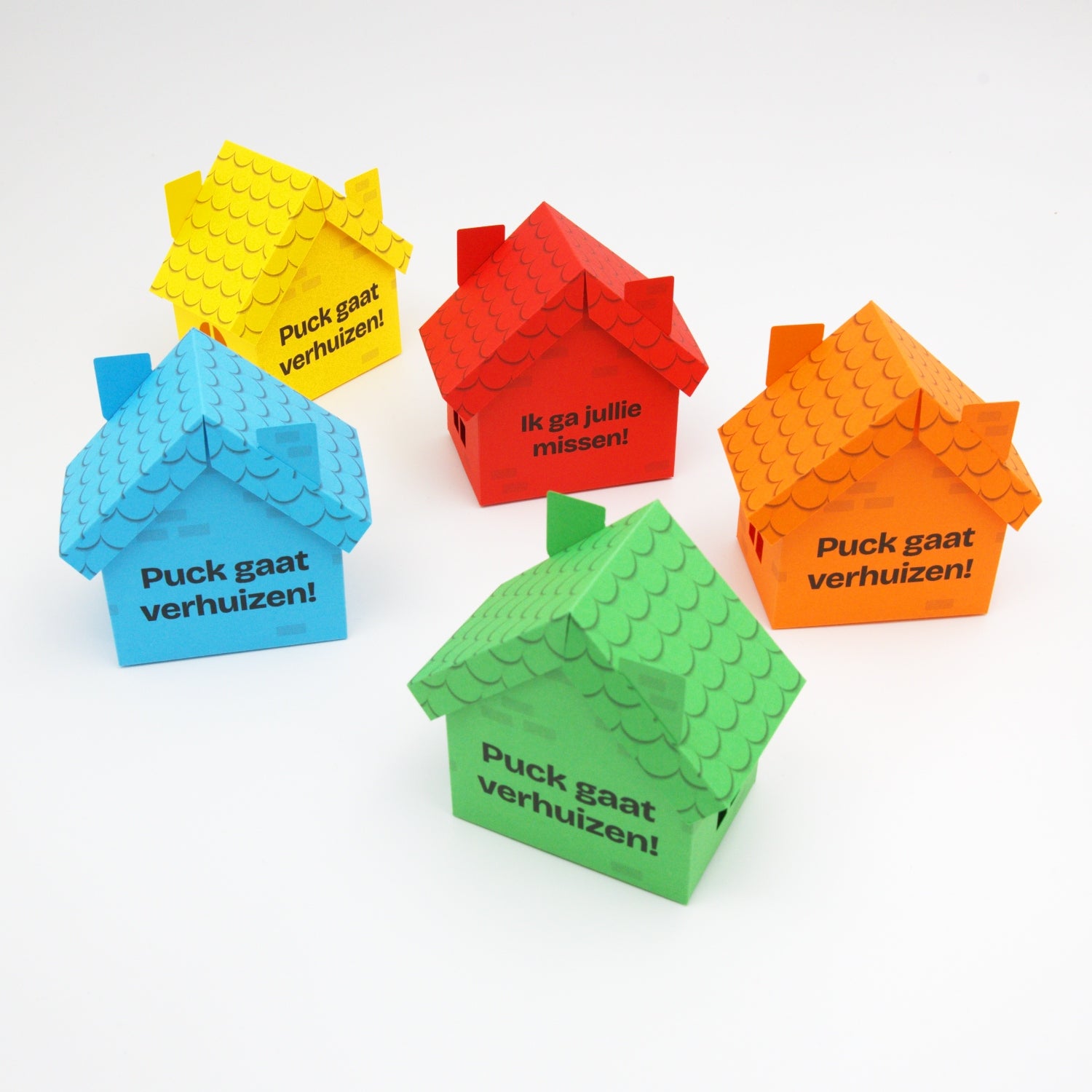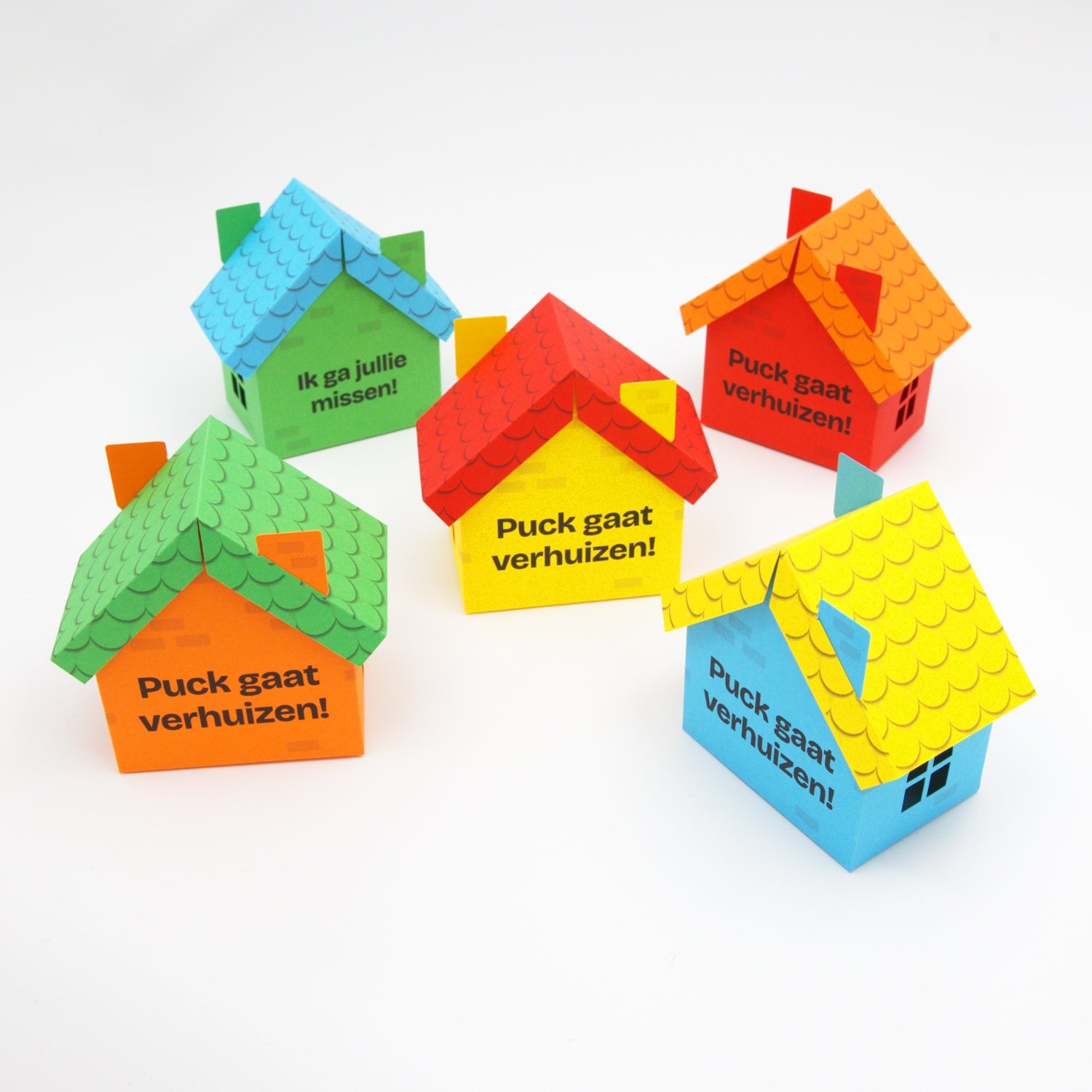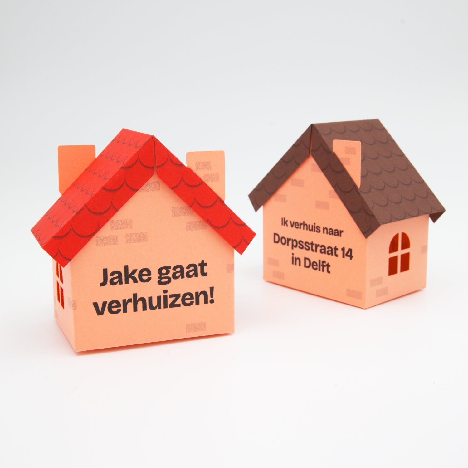 De huizen worden plat geleverd in een envelop of brievenbusdoos en kunnen eenvoudig in elkaar worden gevouwen. Je hoeft alleen de flappen aan de onderkant in elkaar te vouwen en het dakje erop te schuiven. Plakken is dus niet nodig.